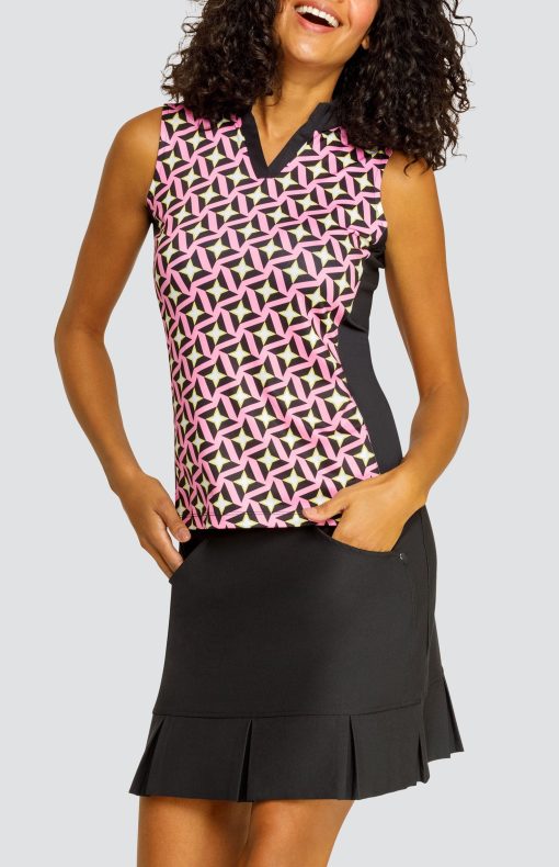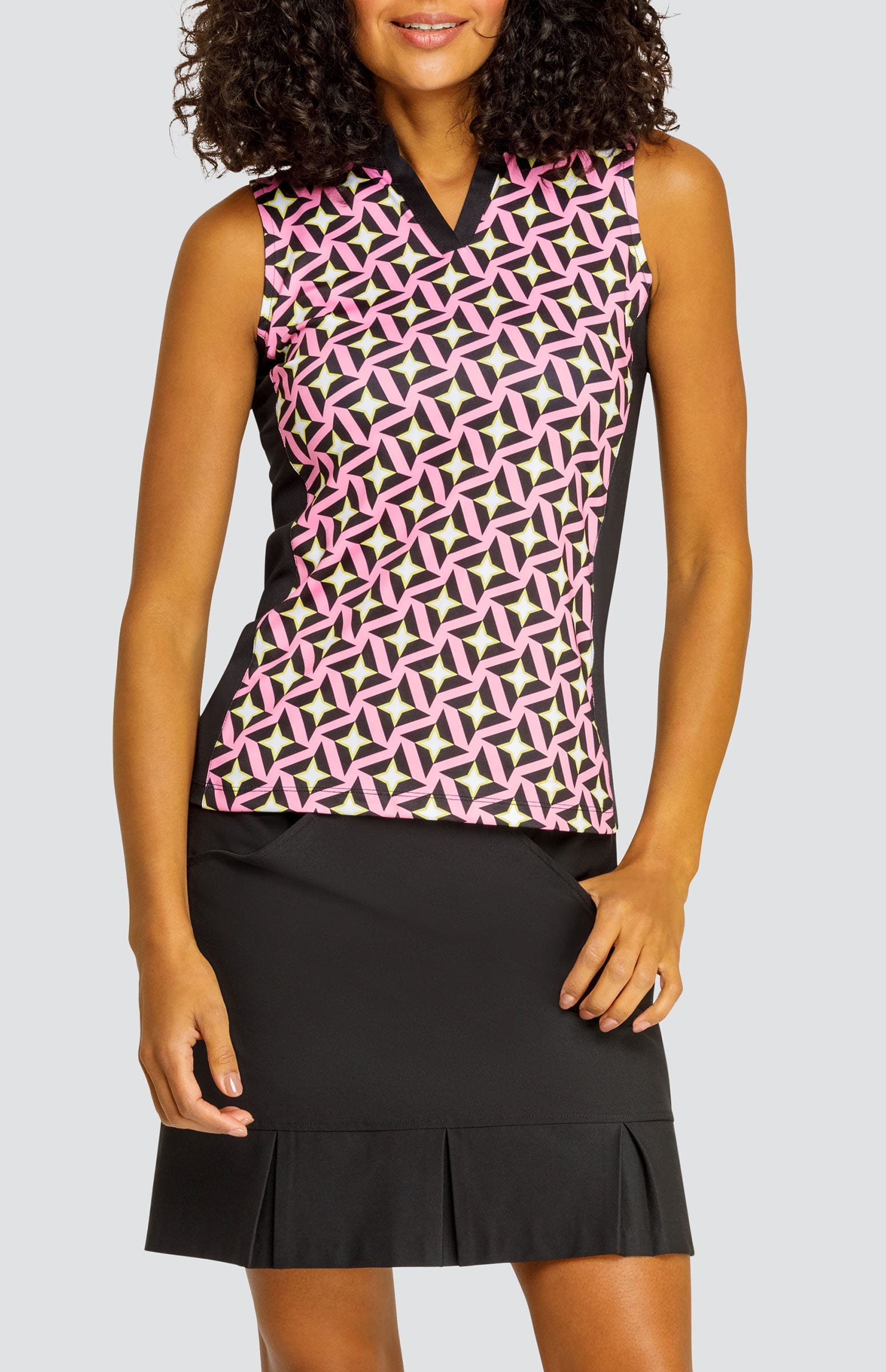 - Sleeveless golf top with open V-funnel neck and side inserts